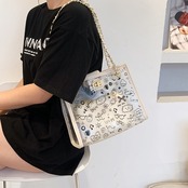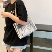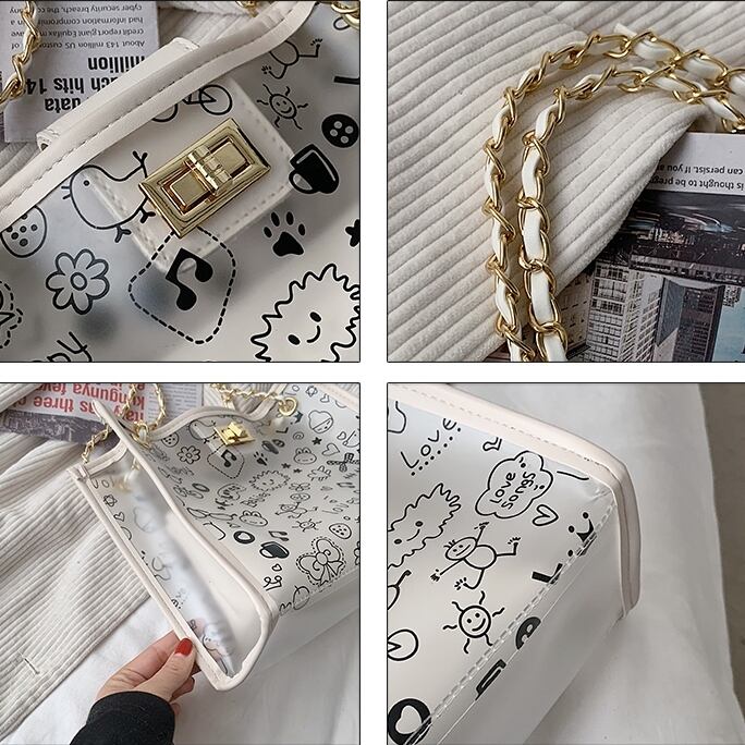 【送料無料】 トートバッグ ショルダーバッグ レディース スクエア型 こなれ感 大容量 総柄 休日 お出かけ デート 女子会 カジュアル フェミニン かわいい ポップ 春 夏 10代 20代 ブラック ホワイト 黒 白 バック PVC クリア スケルトン 透明 透け感 かばん 鞄 おしゃれ 肩がけ 手提げ