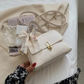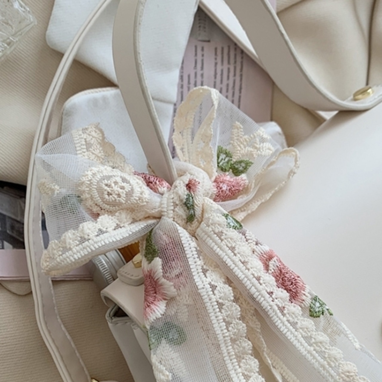 ガーリーなリボンがあしらわれたハンドバッグ。