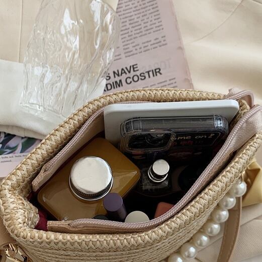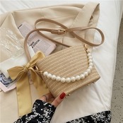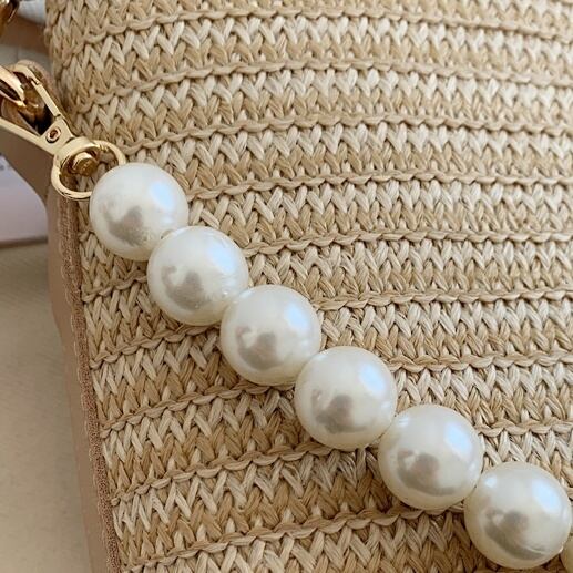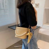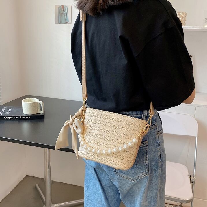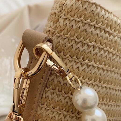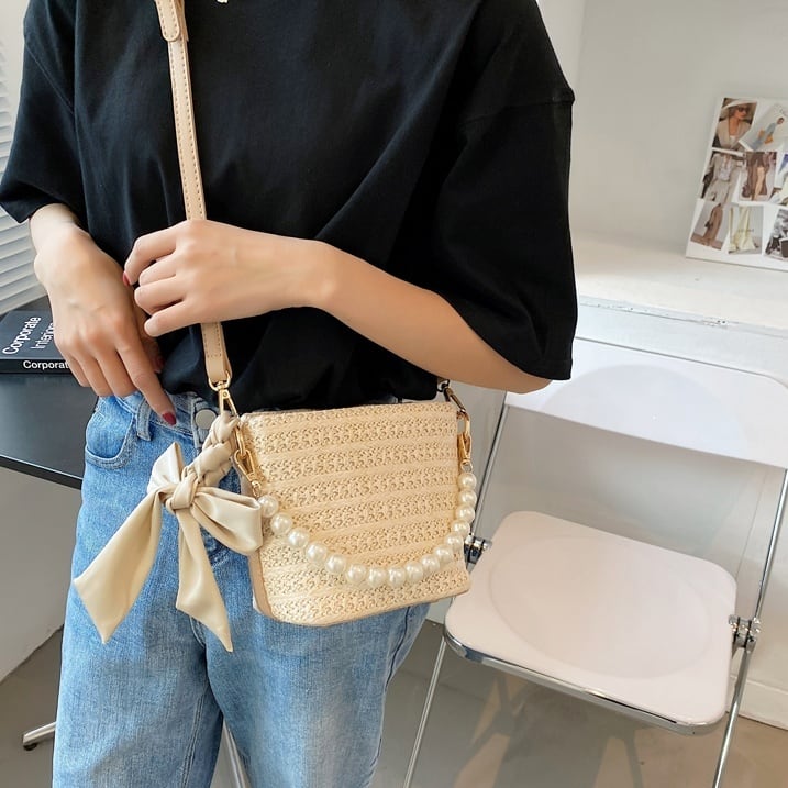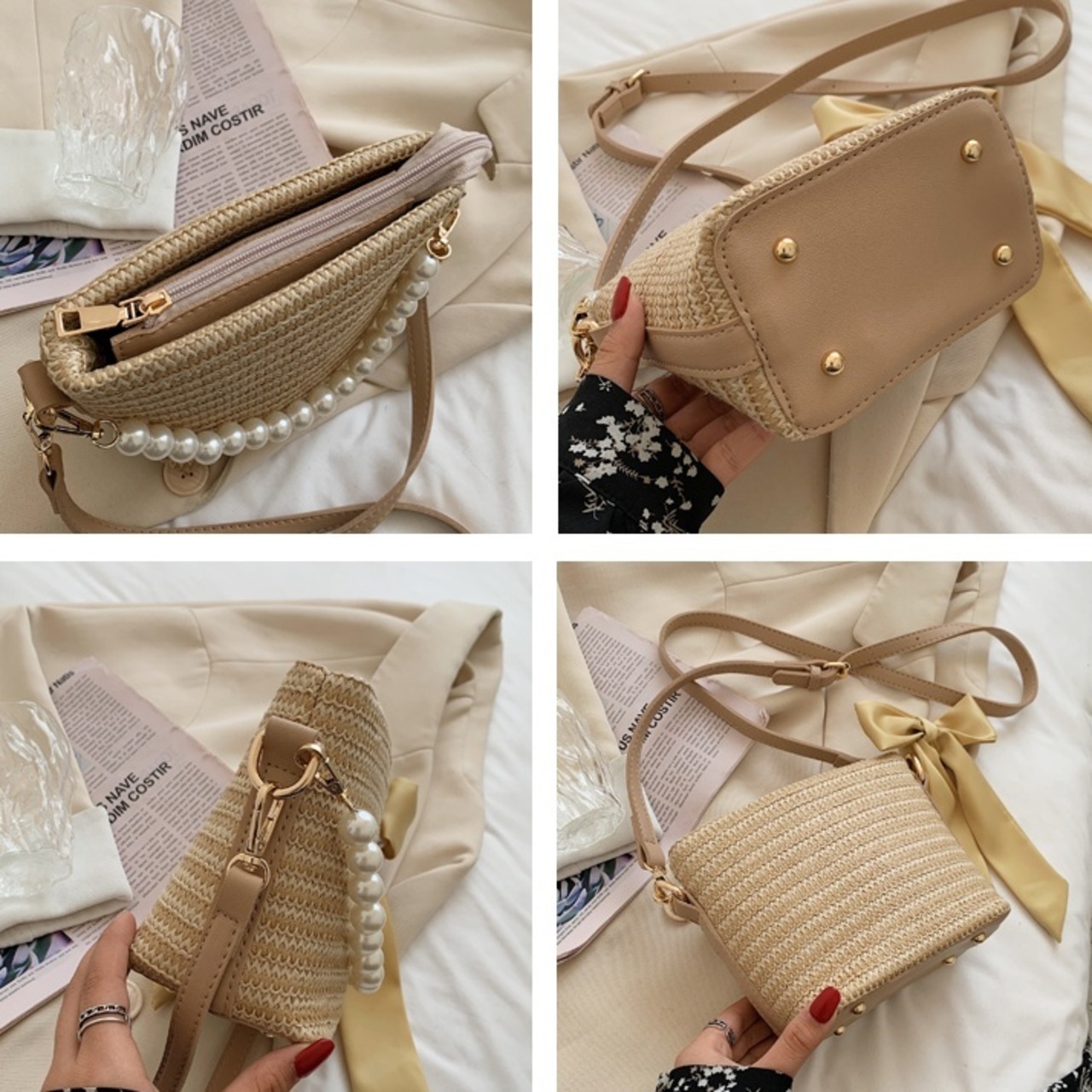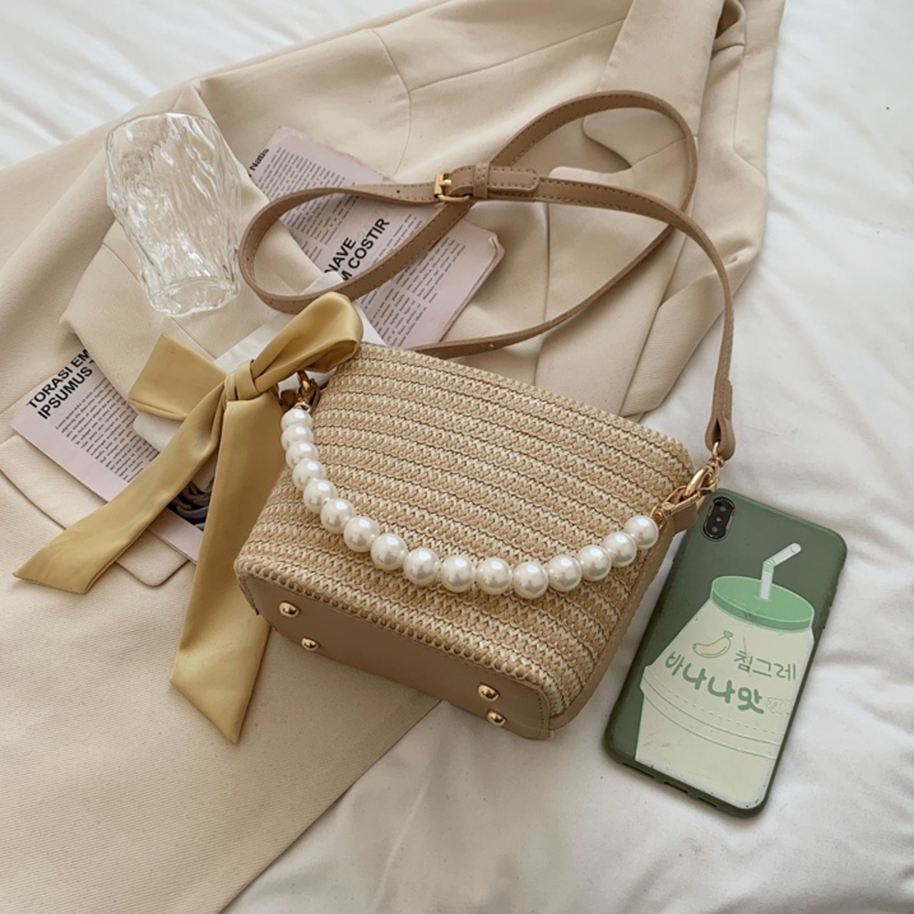 【送料無料】 バケットバッグ ショルダーバッグ レディース わら織り コンパクト 休日 お出かけ デート 春 夏 10代 20代 30代 ホワイト カーキ 白 ミニ バック 大人 かわいい フェミニン ガーリー かばん 鞄 おしゃれ 斜め掛け 肩がけ フェイクパール リボン スカーフ