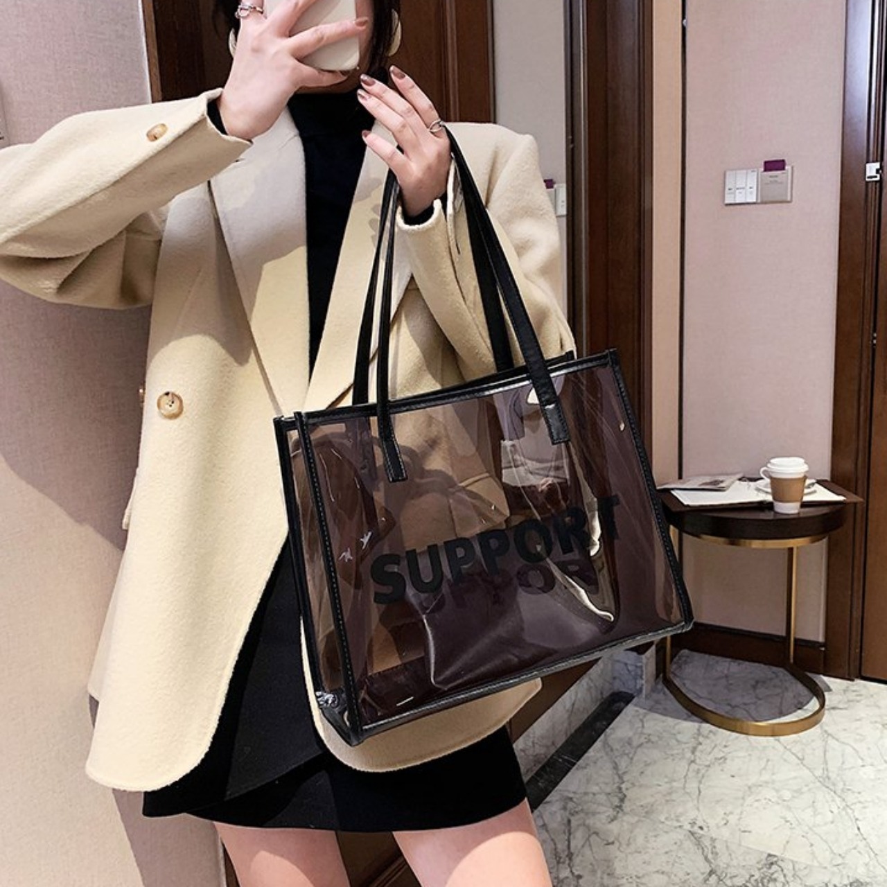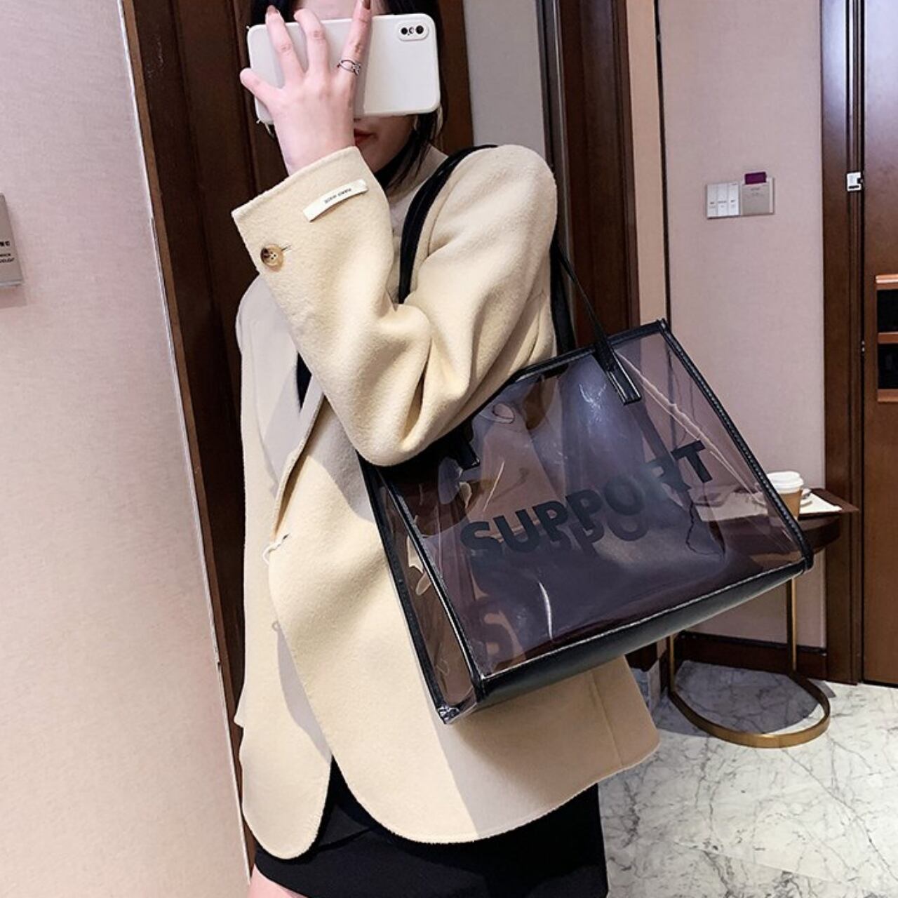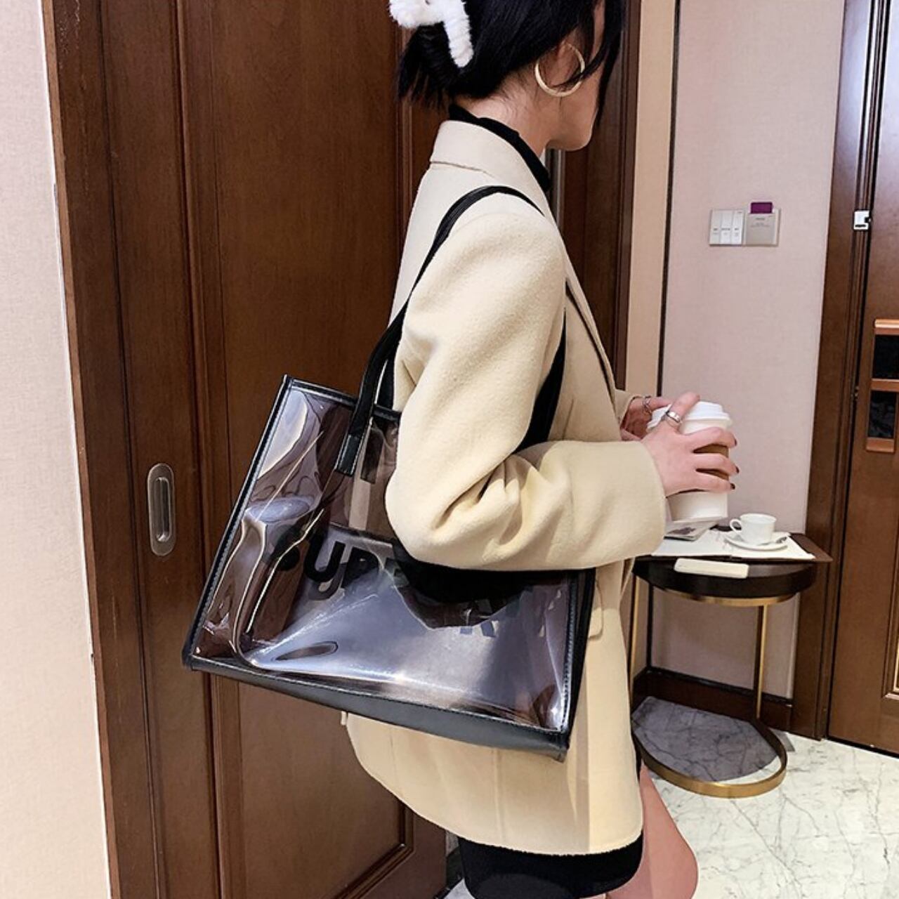 【送料無料】 トートバッグ クリアバッグ 3色展開 大容量 通勤 通学 肩掛け A4 カジュアル クリア 透け感 透明 ブラック ホワイト コーヒー 黒 白 茶 10代 20代 カレッジコーデ お出かけ デート 夏