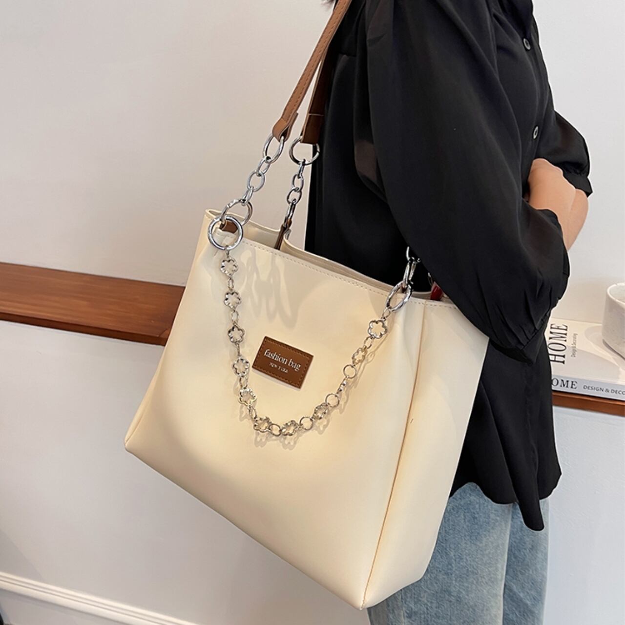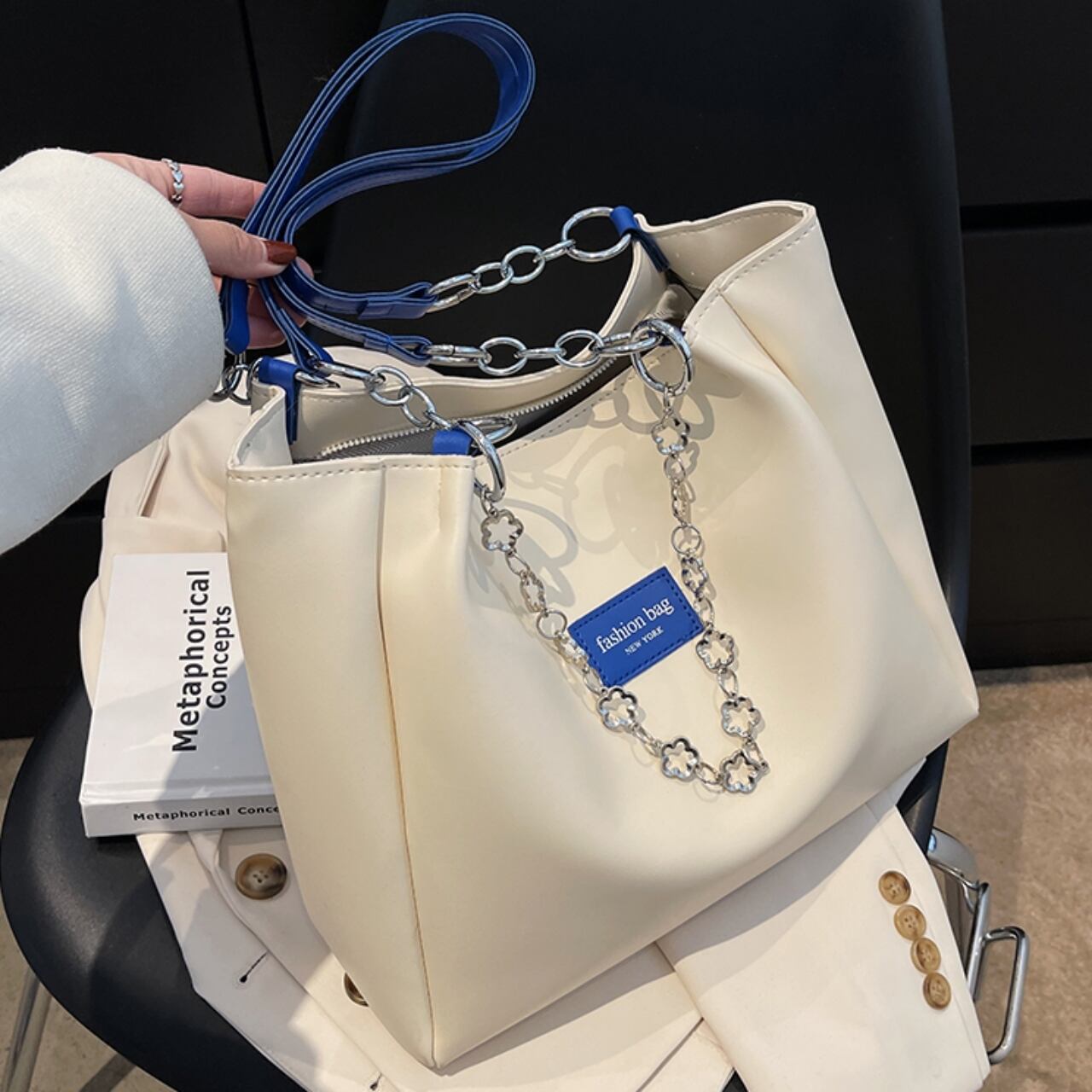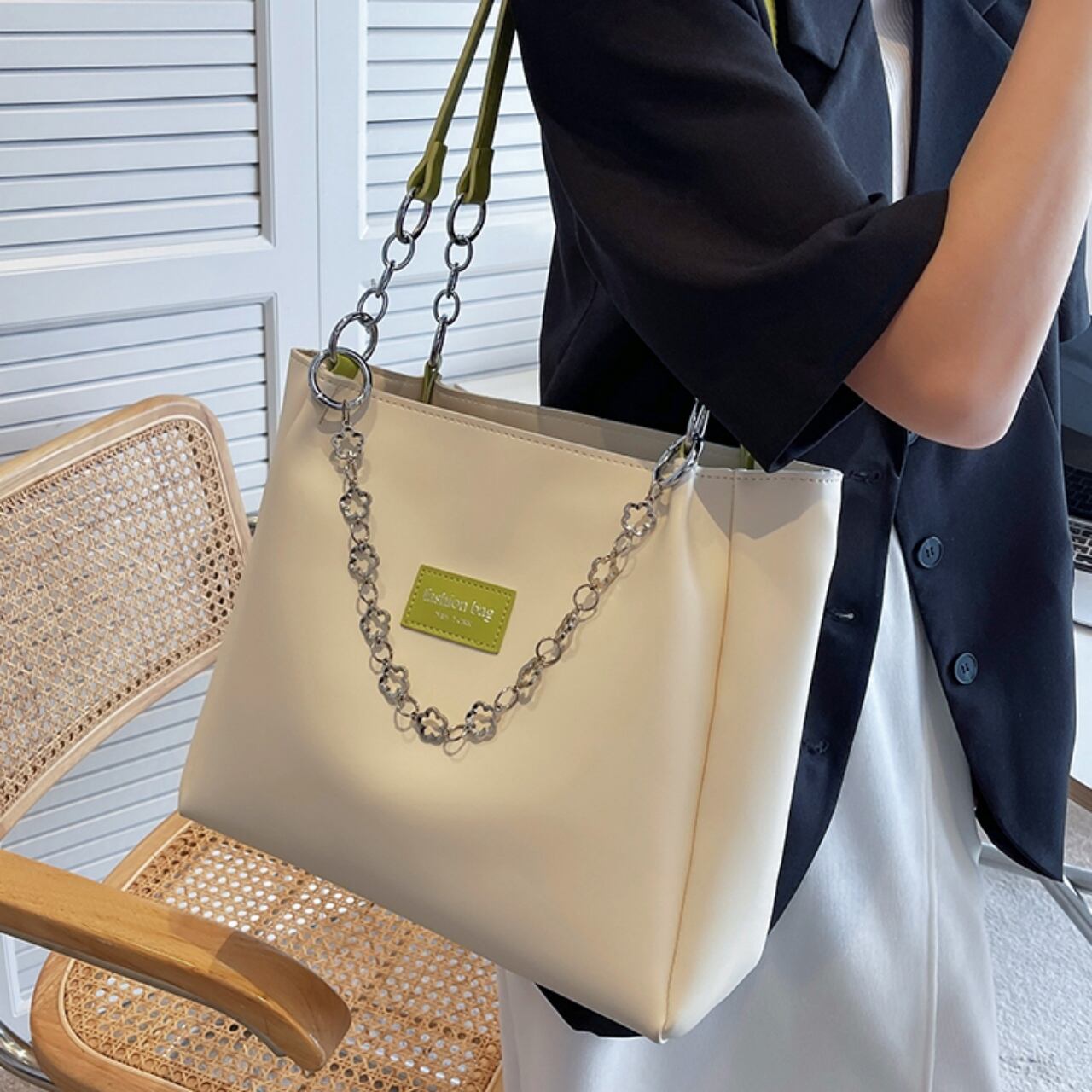 【送料無料】トートバッグ 5色展開 大容量 A4 PU 大人可愛い ブラック ブラウン カーキ グリーン クラインブルー チェーン フラワーモチーフ カジュアルコーデ 通勤 通学 オフィススタイル 通勤スタイル