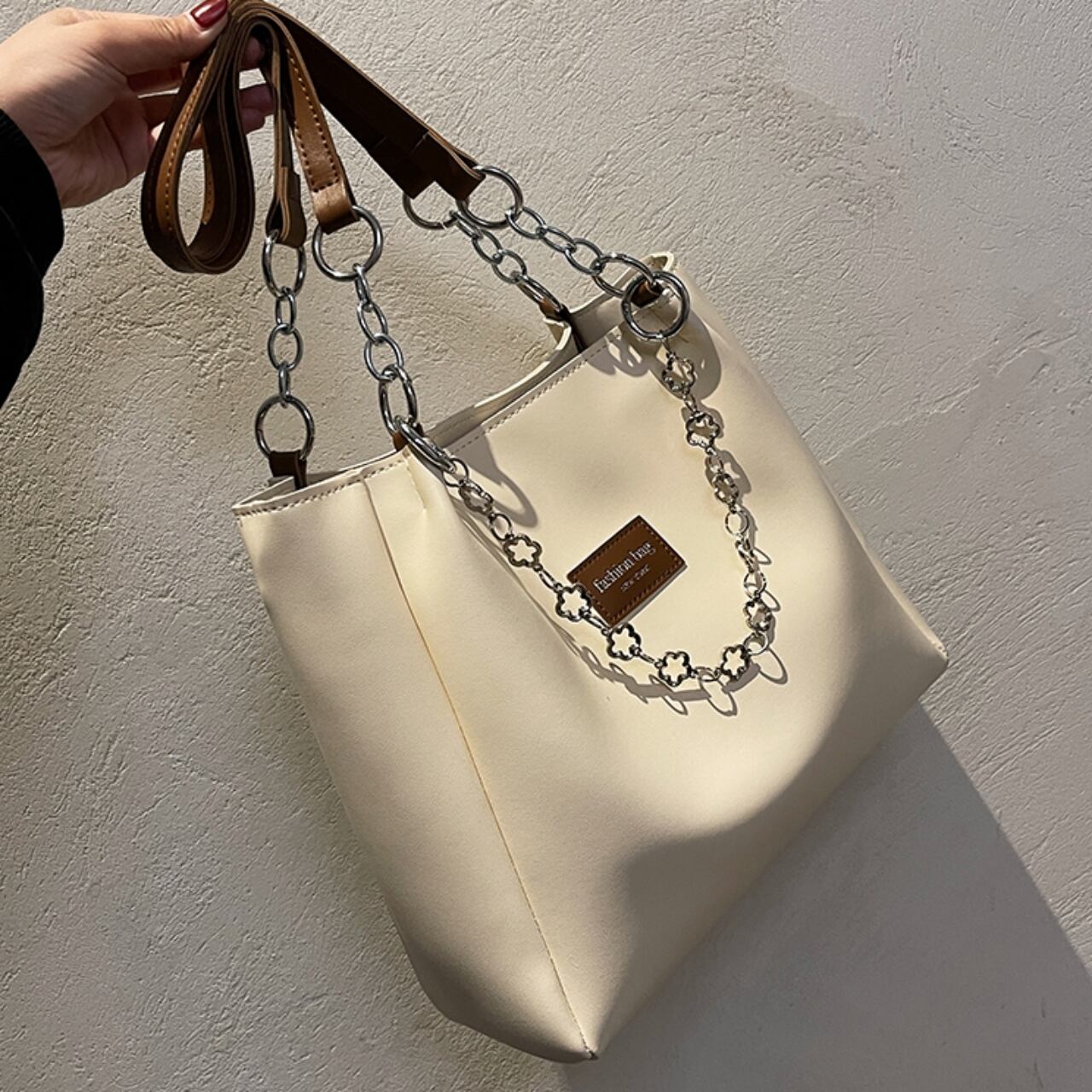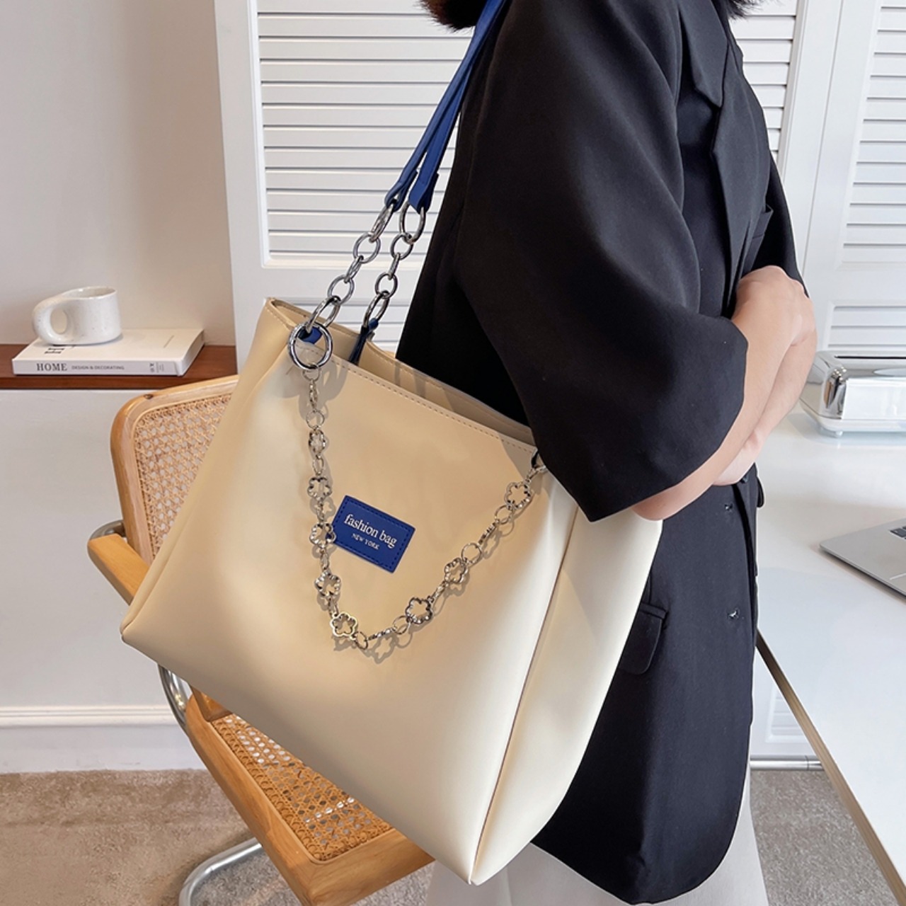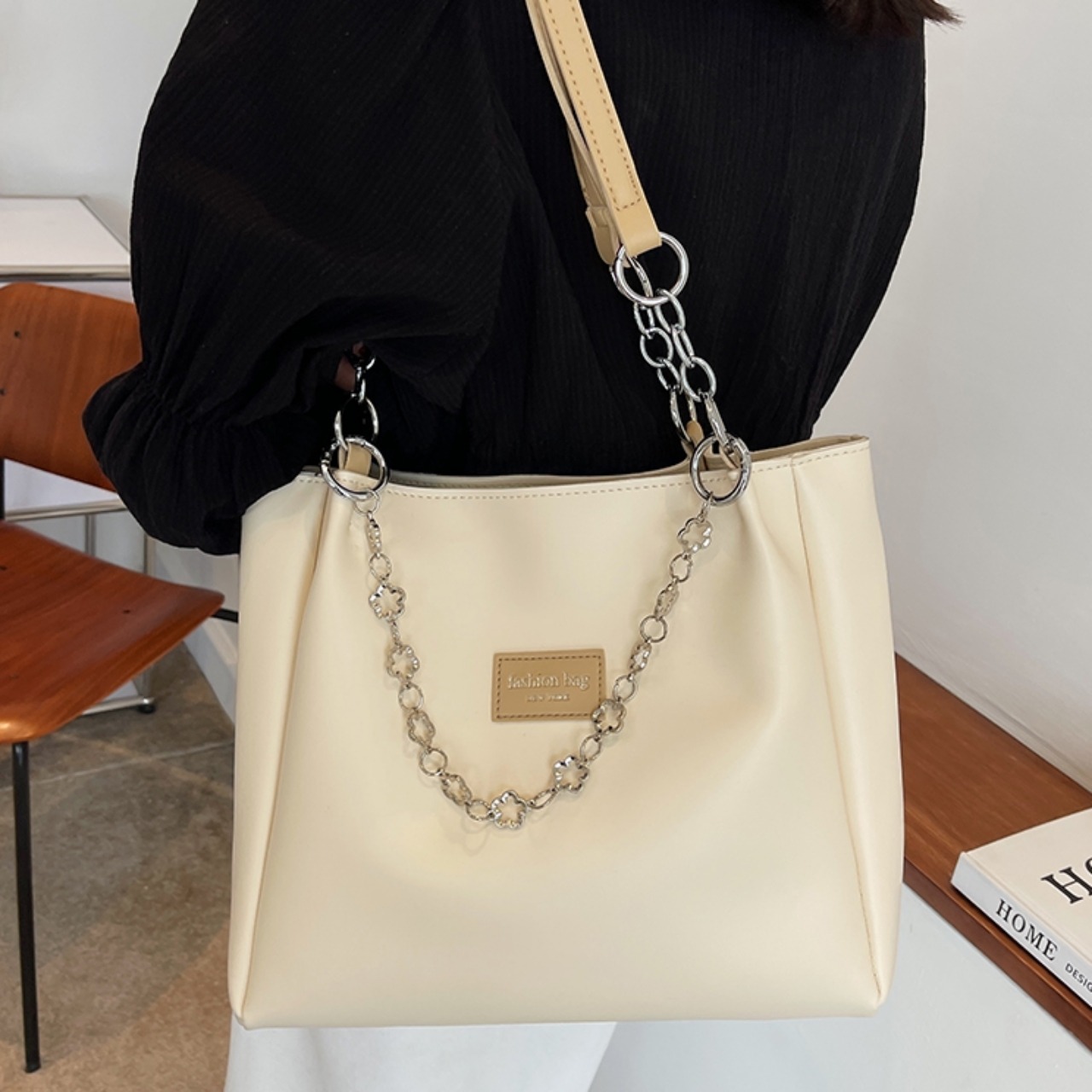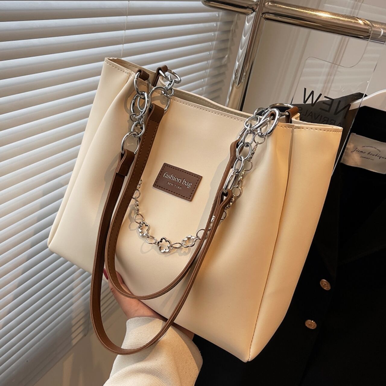 【送料無料】トートバッグ 5色展開 大容量 A4 PU 大人可愛い ブラック ブラウン カーキ グリーン クラインブルー チェーン フラワーモチーフ カジュアルコーデ 通勤 通学 オフィススタイル 通勤スタイル