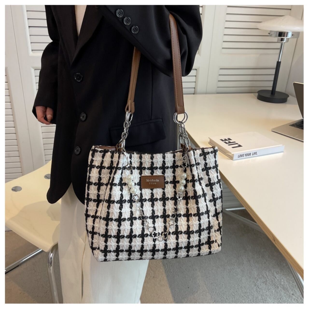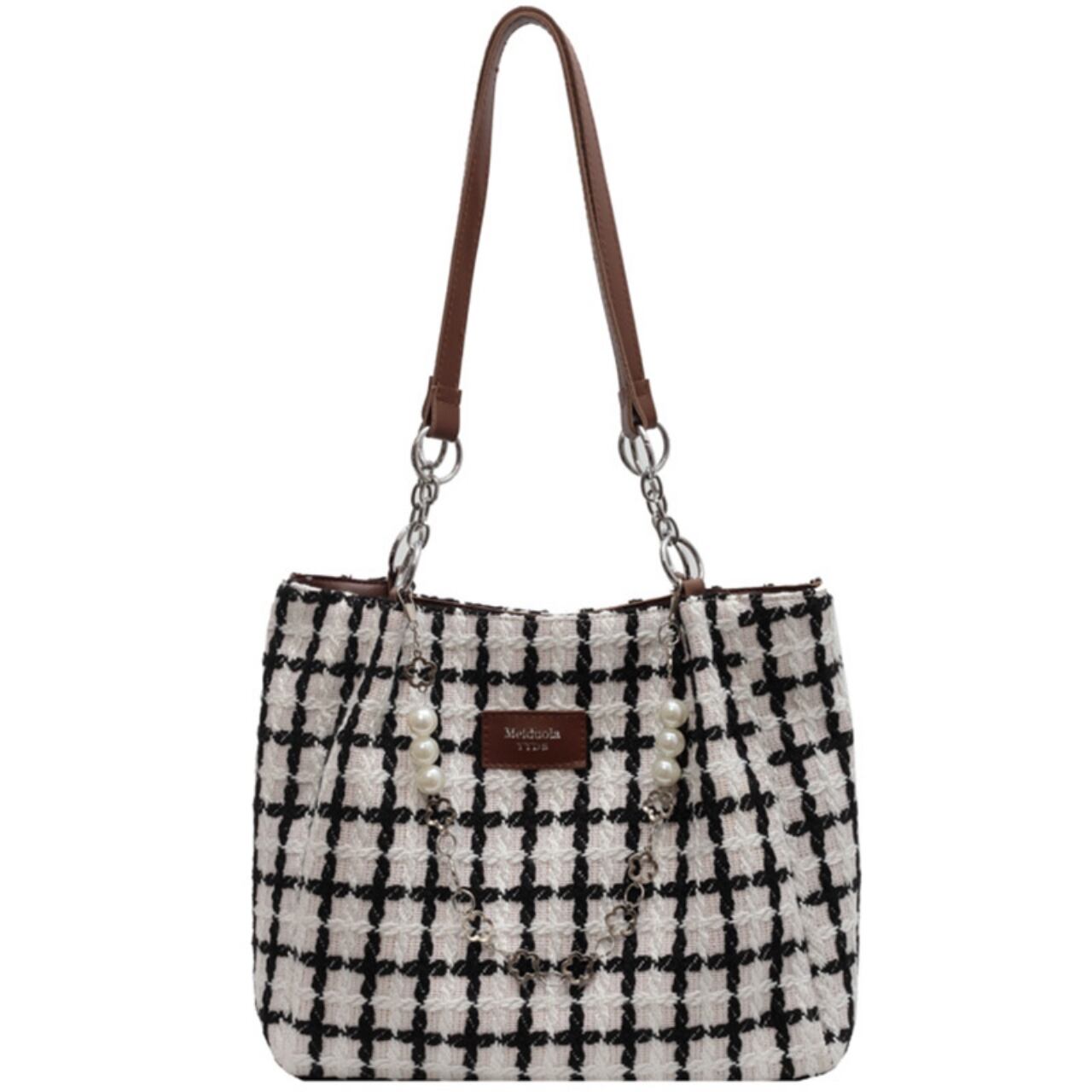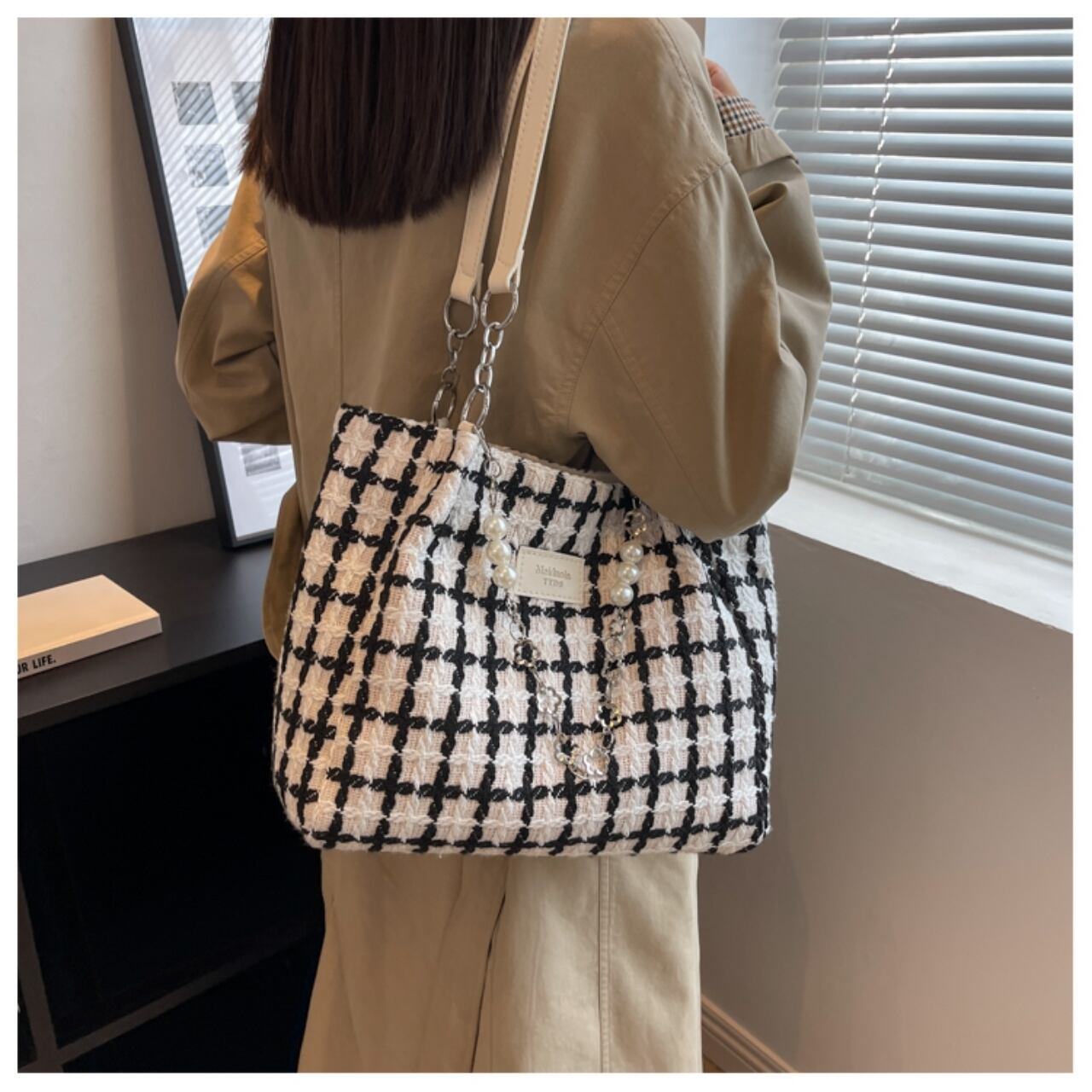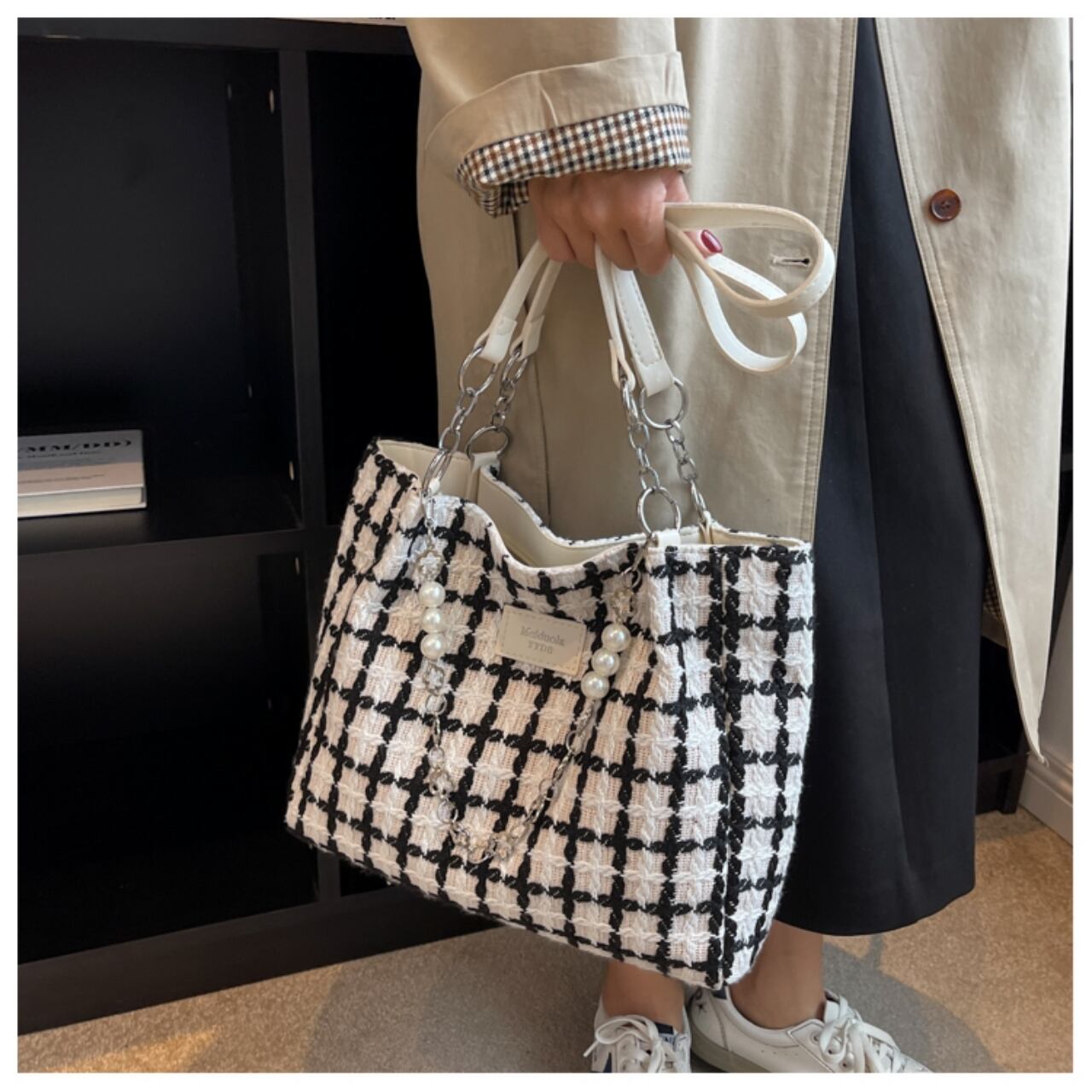 【送料無料】トートバッグ 3色展開 大容量 チェック柄 レトロガーリー パール装飾 チェーン 肩掛け 内ポケット 大人可愛い 通勤スタイル 通学 カレッジコーデ 秋 ブラック ブラウン ベージュ お出かけ