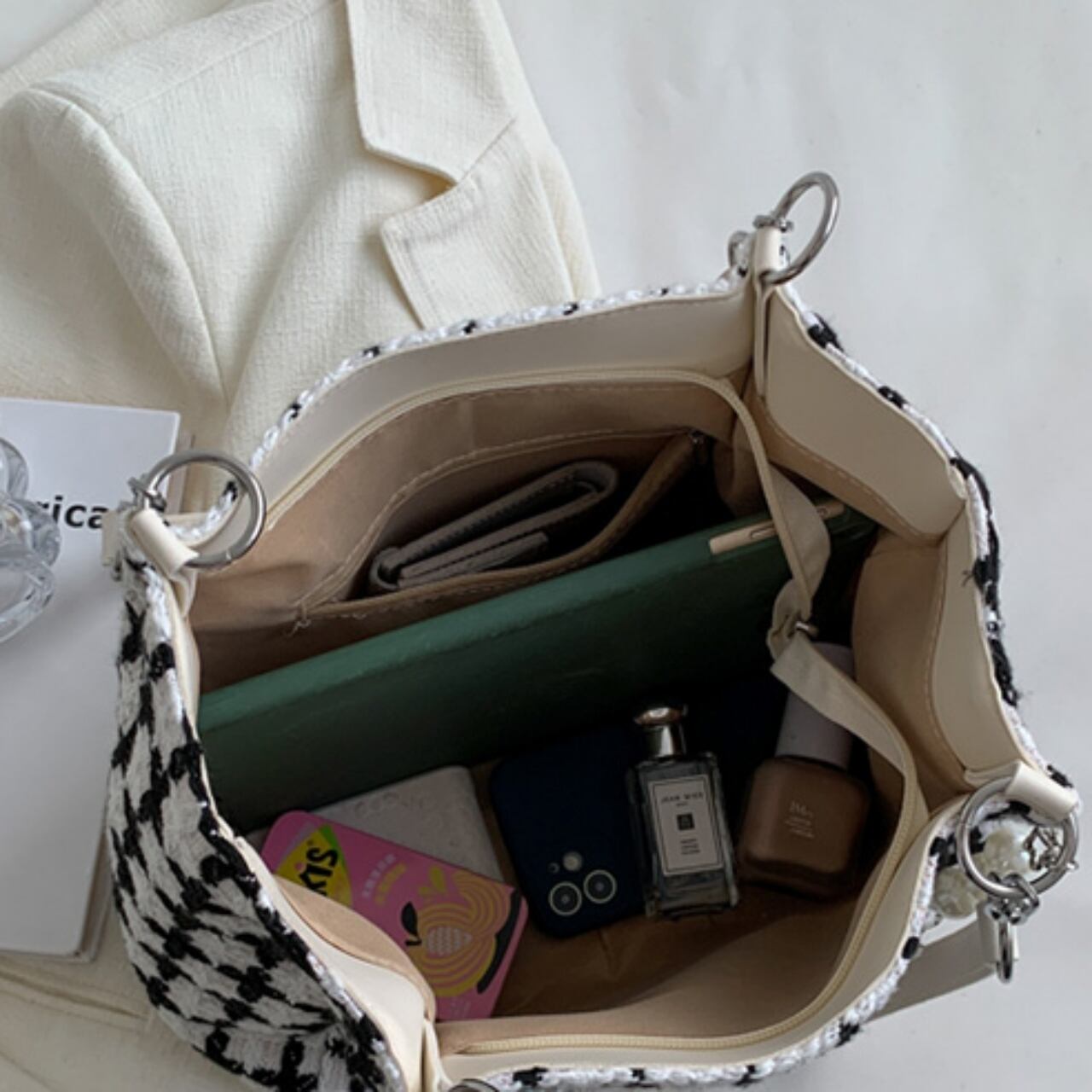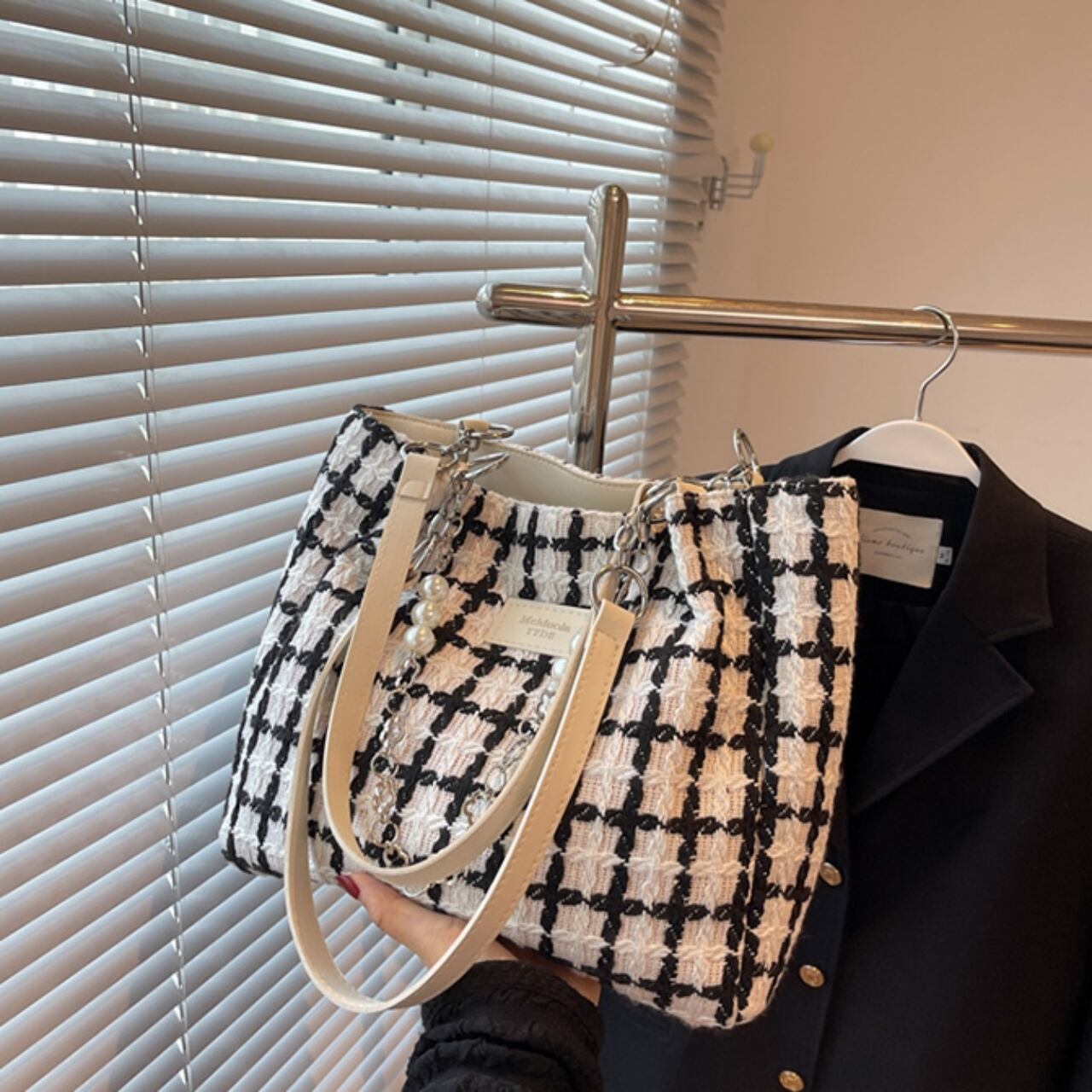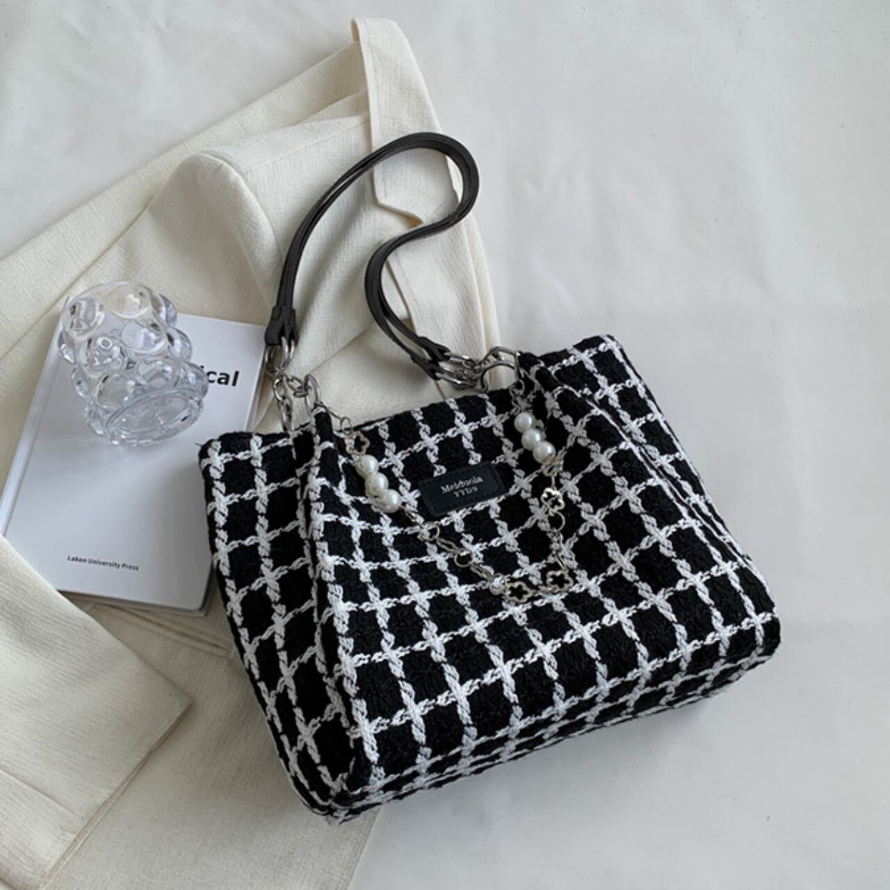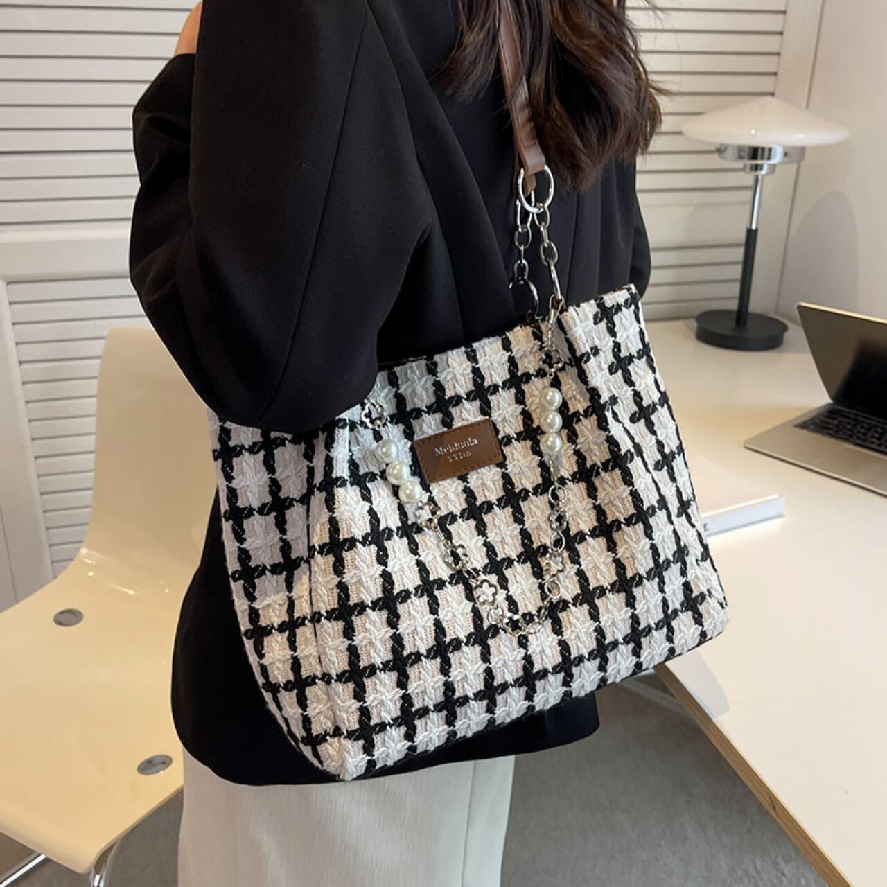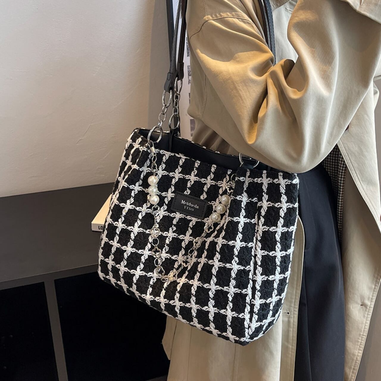 【送料無料】トートバッグ 3色展開 大容量 チェック柄 レトロガーリー パール装飾 チェーン 肩掛け 内ポケット 大人可愛い 通勤スタイル 通学 カレッジコーデ 秋 ブラック ブラウン ベージュ お出かけ