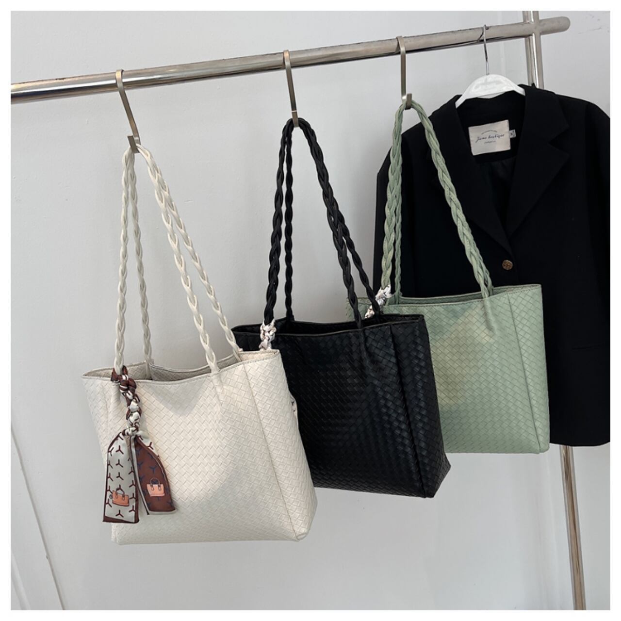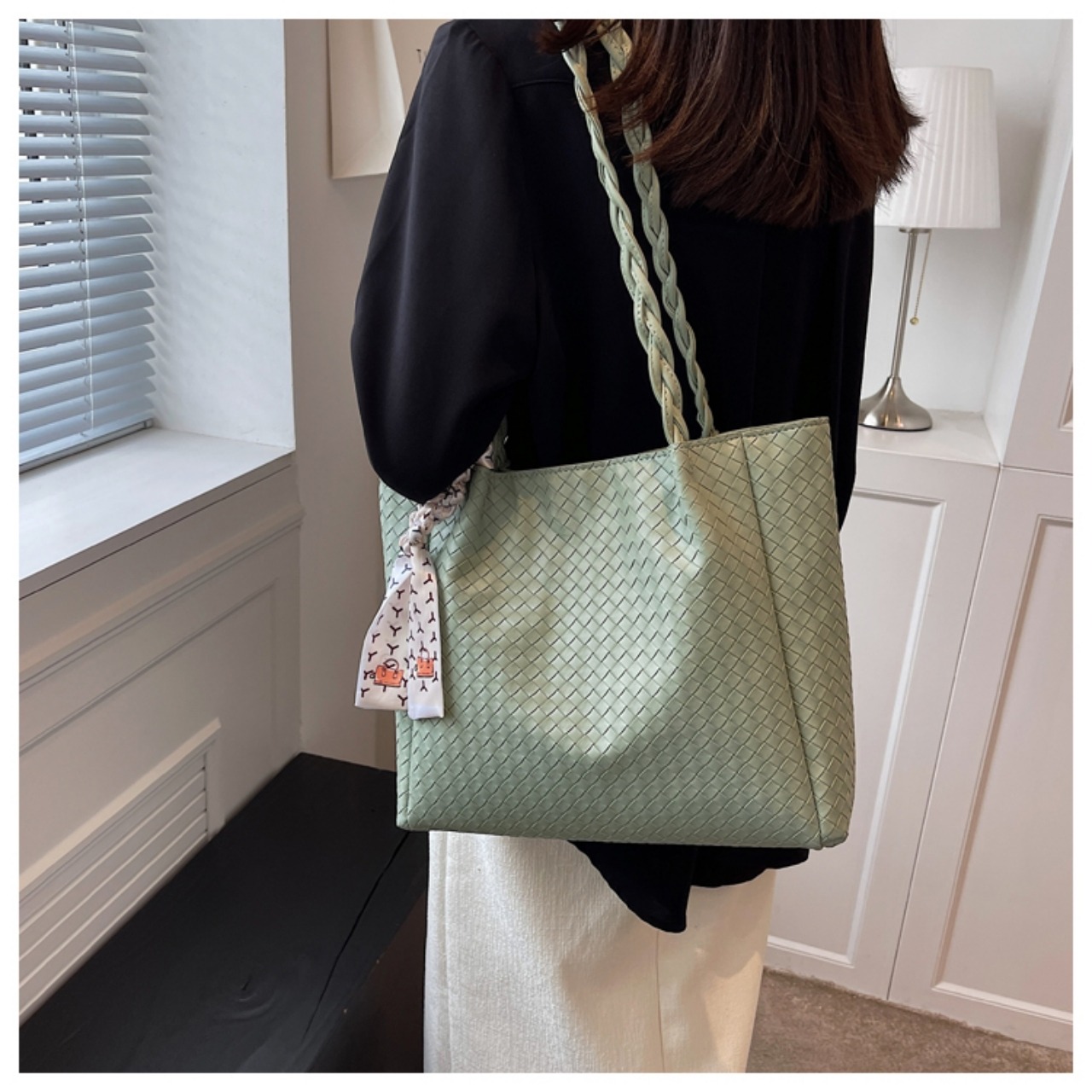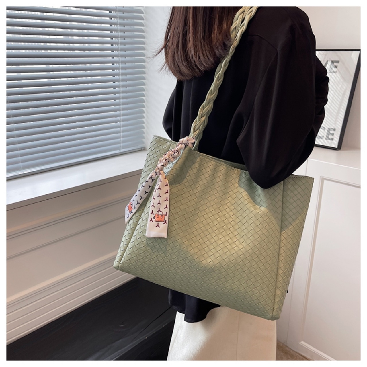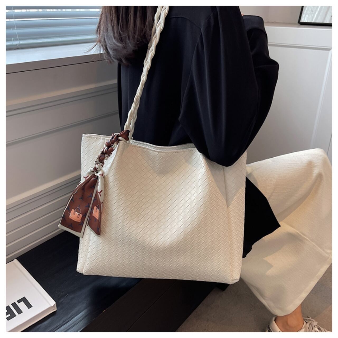 【送料無料】トートバッグ 3色展開 ブラック グリーン ホワイト 黒 緑 白 大容量 スカーフ付き カジュアル 大人可愛い 通勤 通学 通勤スタイル カレッジコーデ デート お出かけ