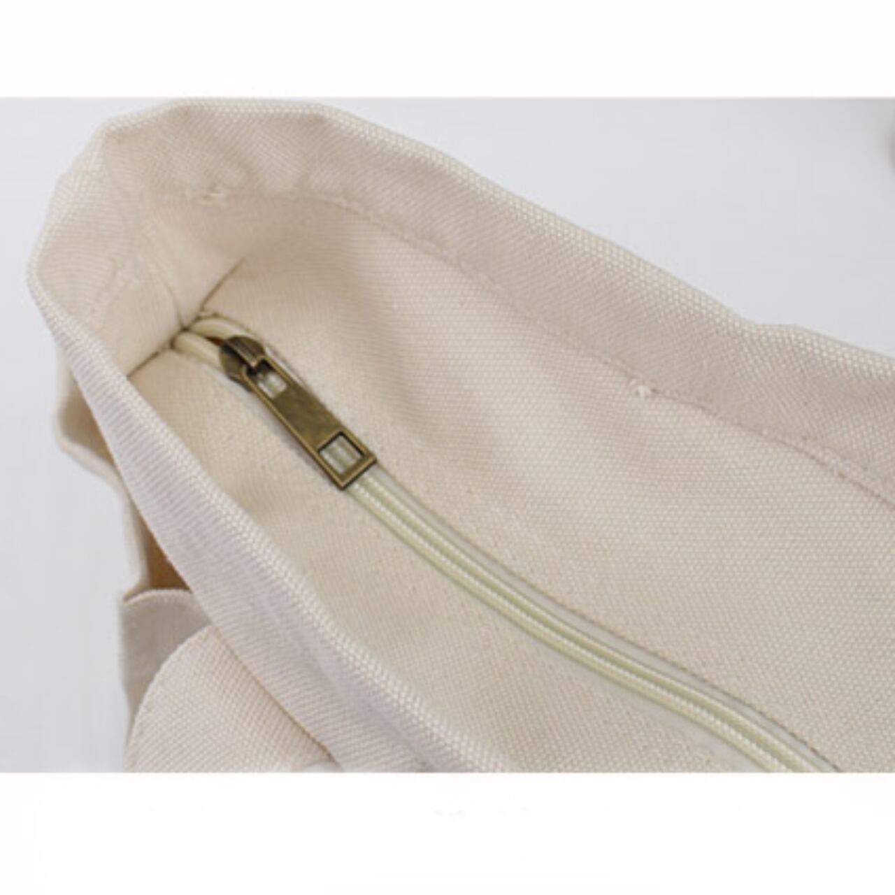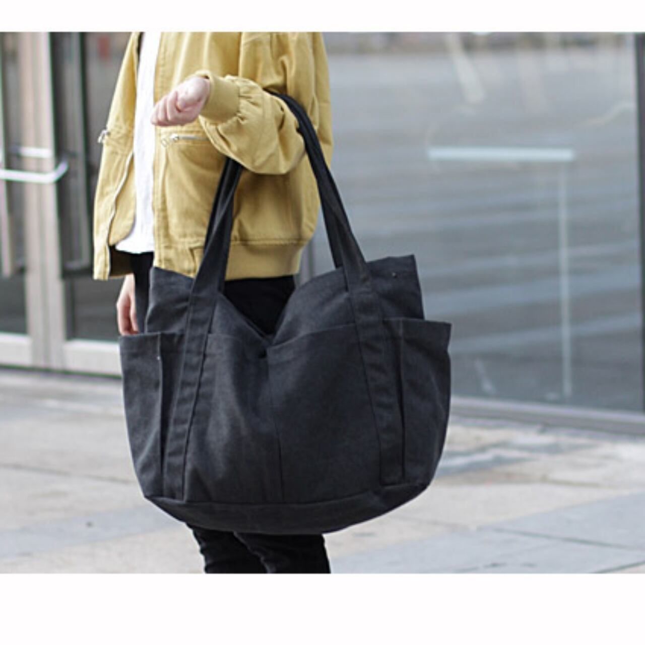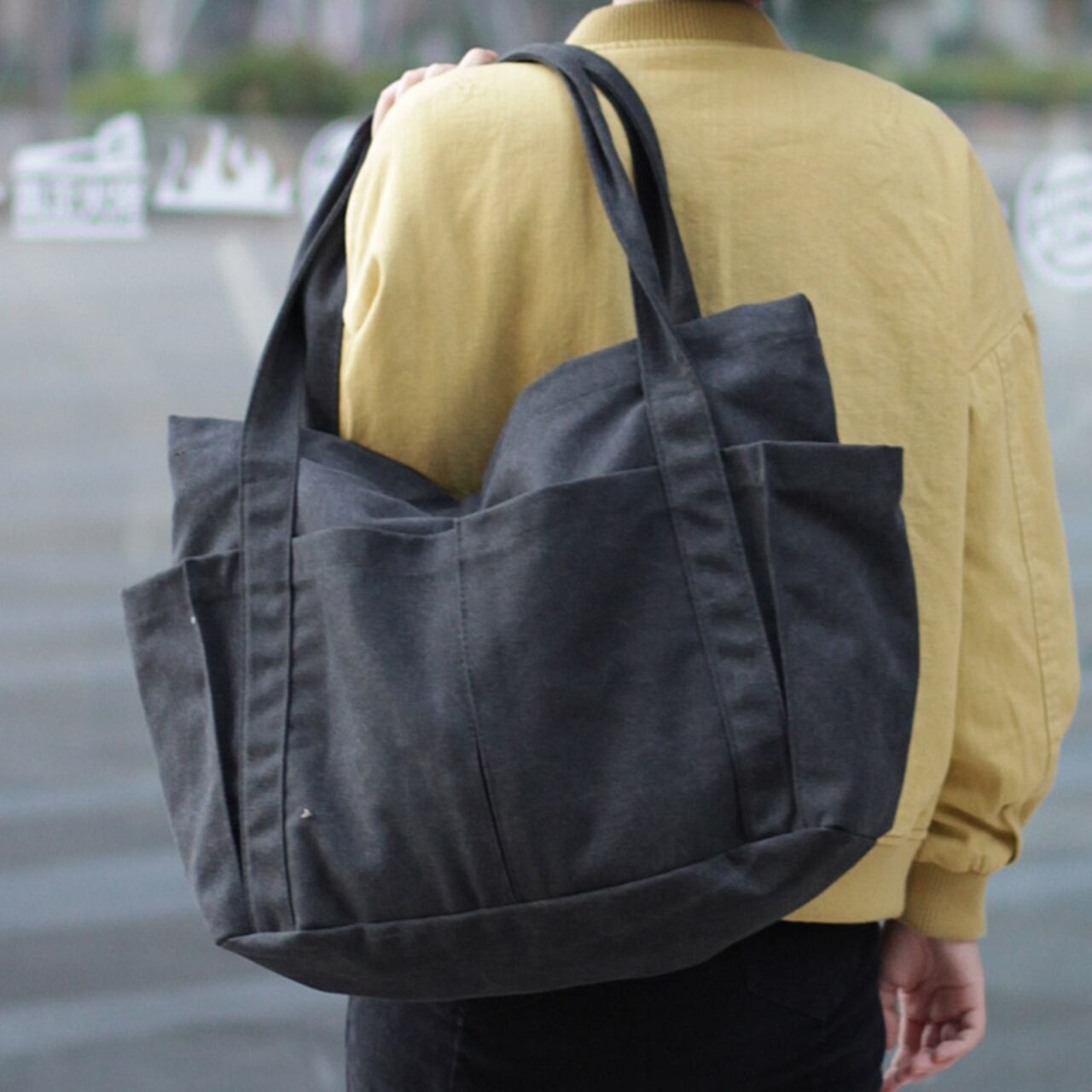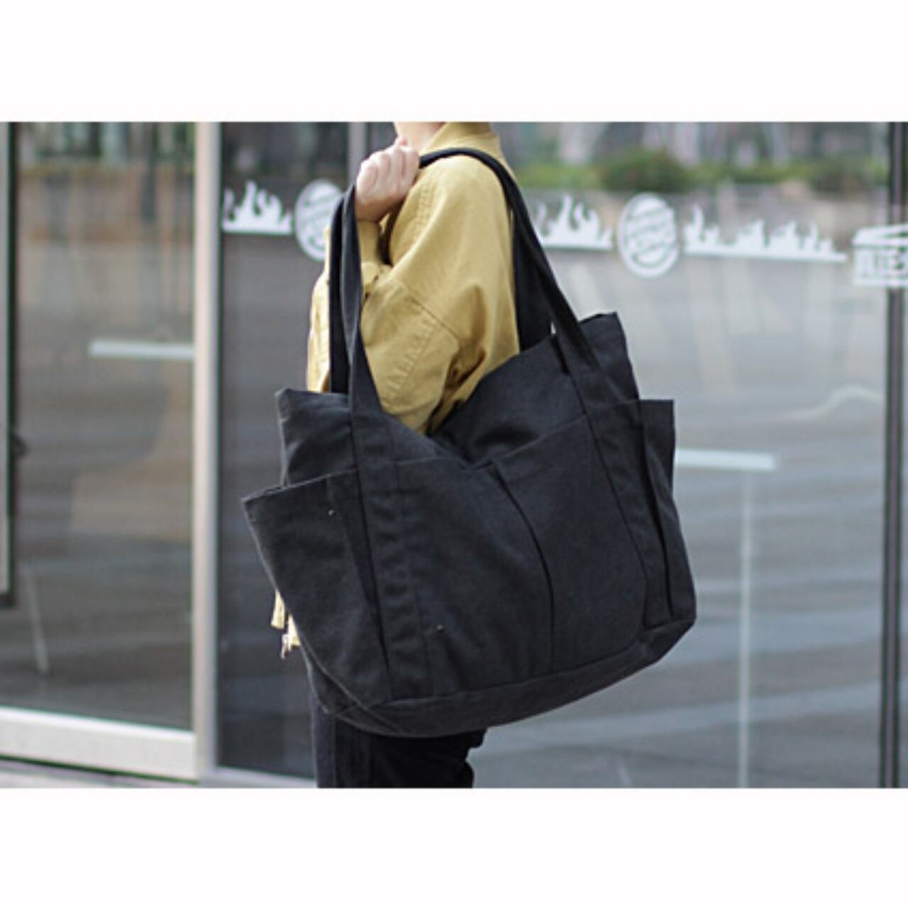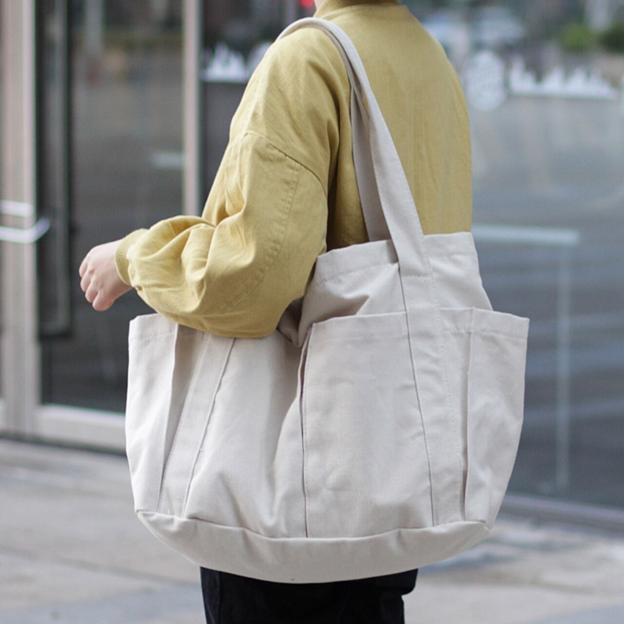【送料無料】トートバッグ 2色 ホワイト ブラック 白 黒 キャンバス 大容量 多機能 多数ポケット カジュアル 通勤 通学 マイバッグ ファスナー 肩掛け