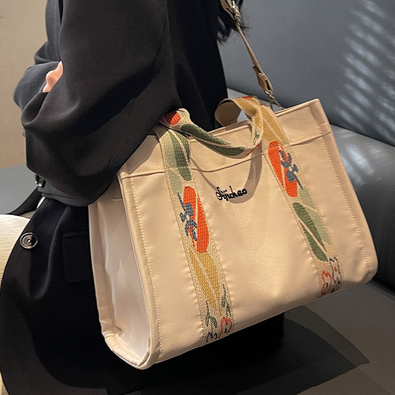 【送料無料】トートバッグ ショルダーバッグ 2way ブラック ベージュ 肩掛け 斜め掛け シンプル カジュアルコーデ 大容量 キャンバス 通学スタイル 通勤スタイル