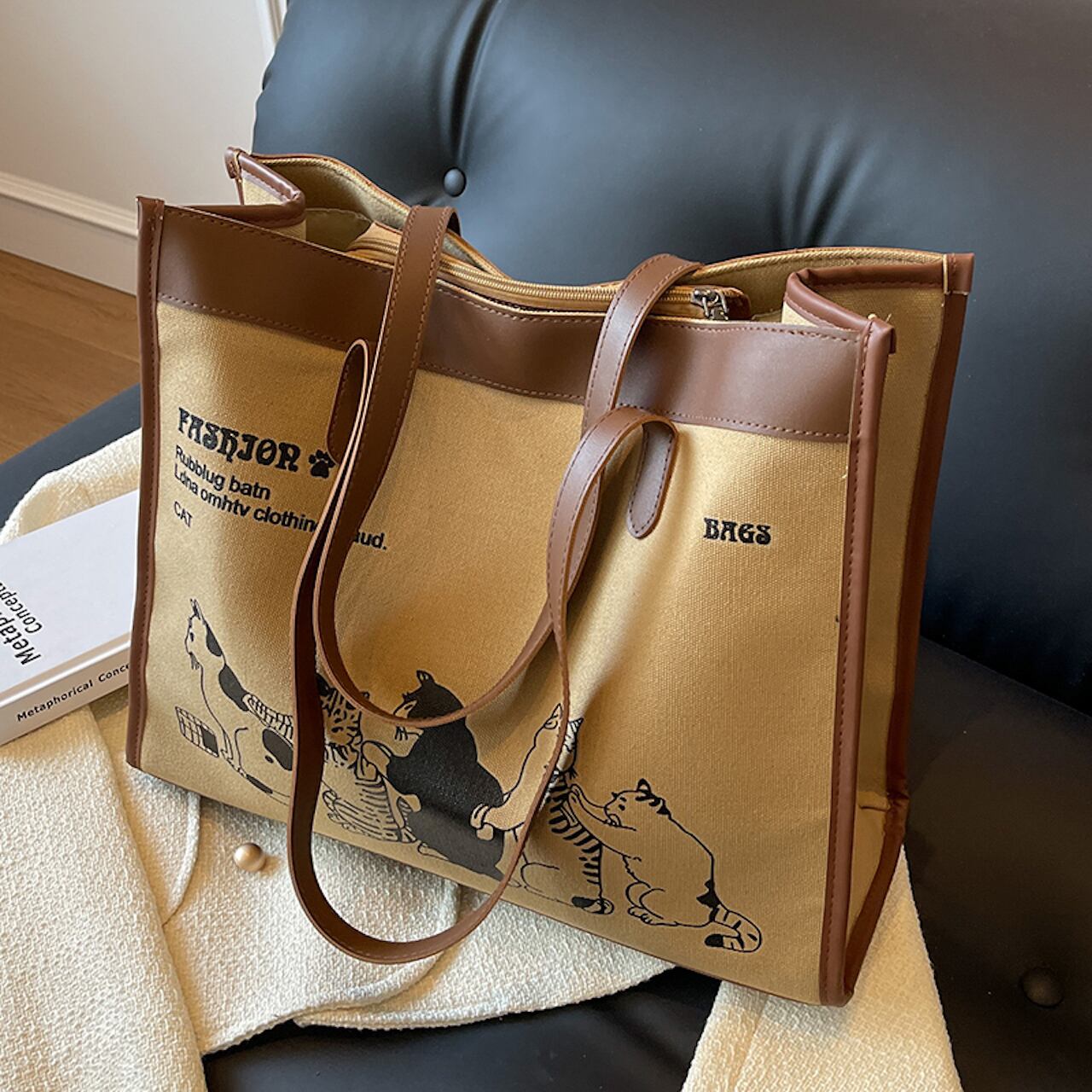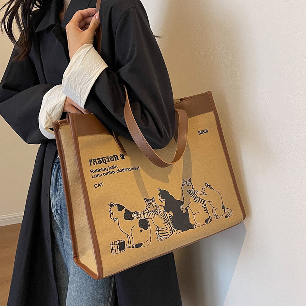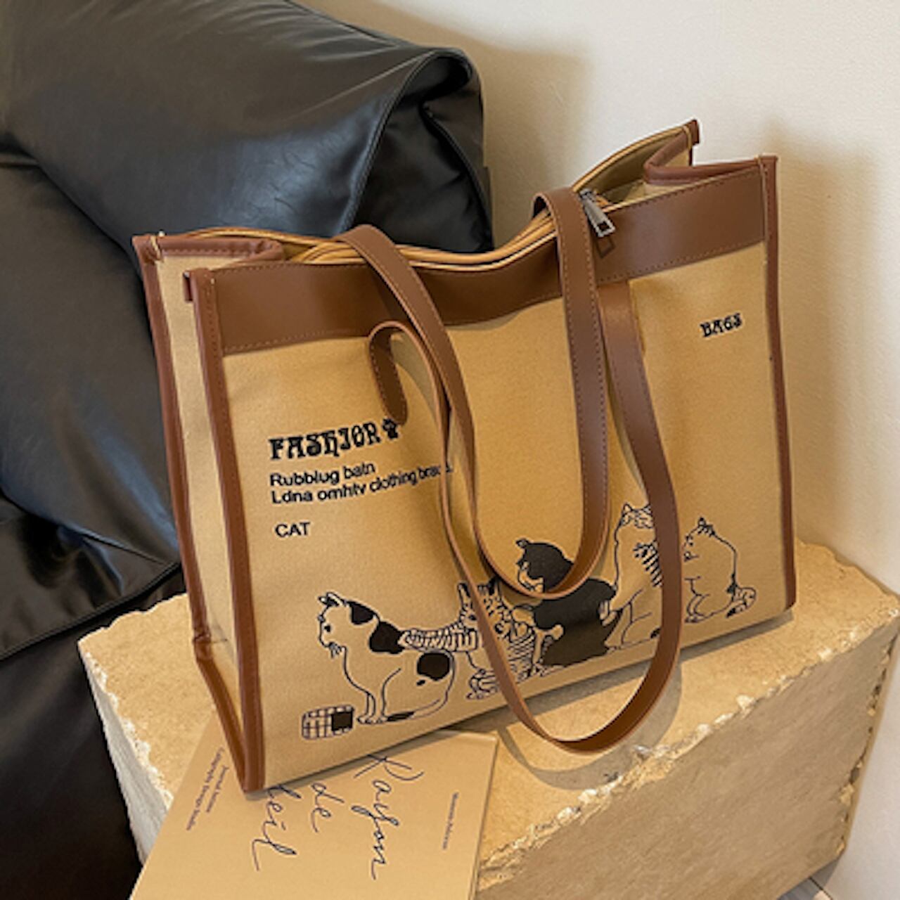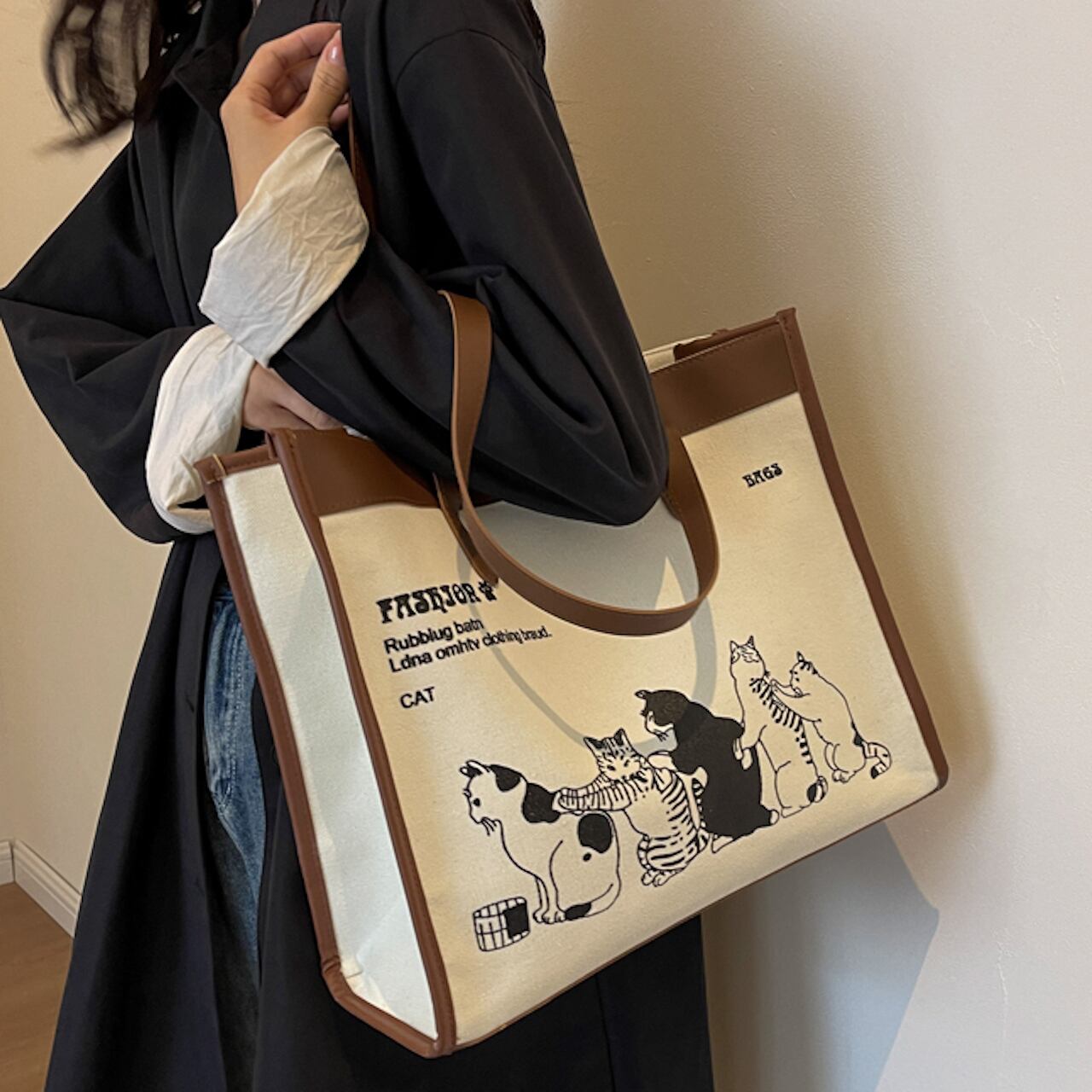 【送料無料】トートバッグ 3色展開 ブラック カーキ オフホワイト 猫 キャット かわいい 20代 通勤 通学 通学スタイル カレッジコーデ 大容量 お出かけ