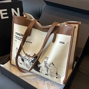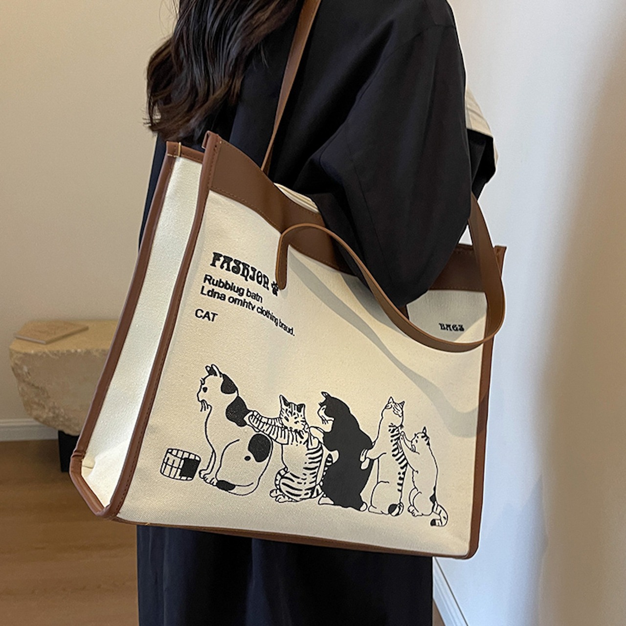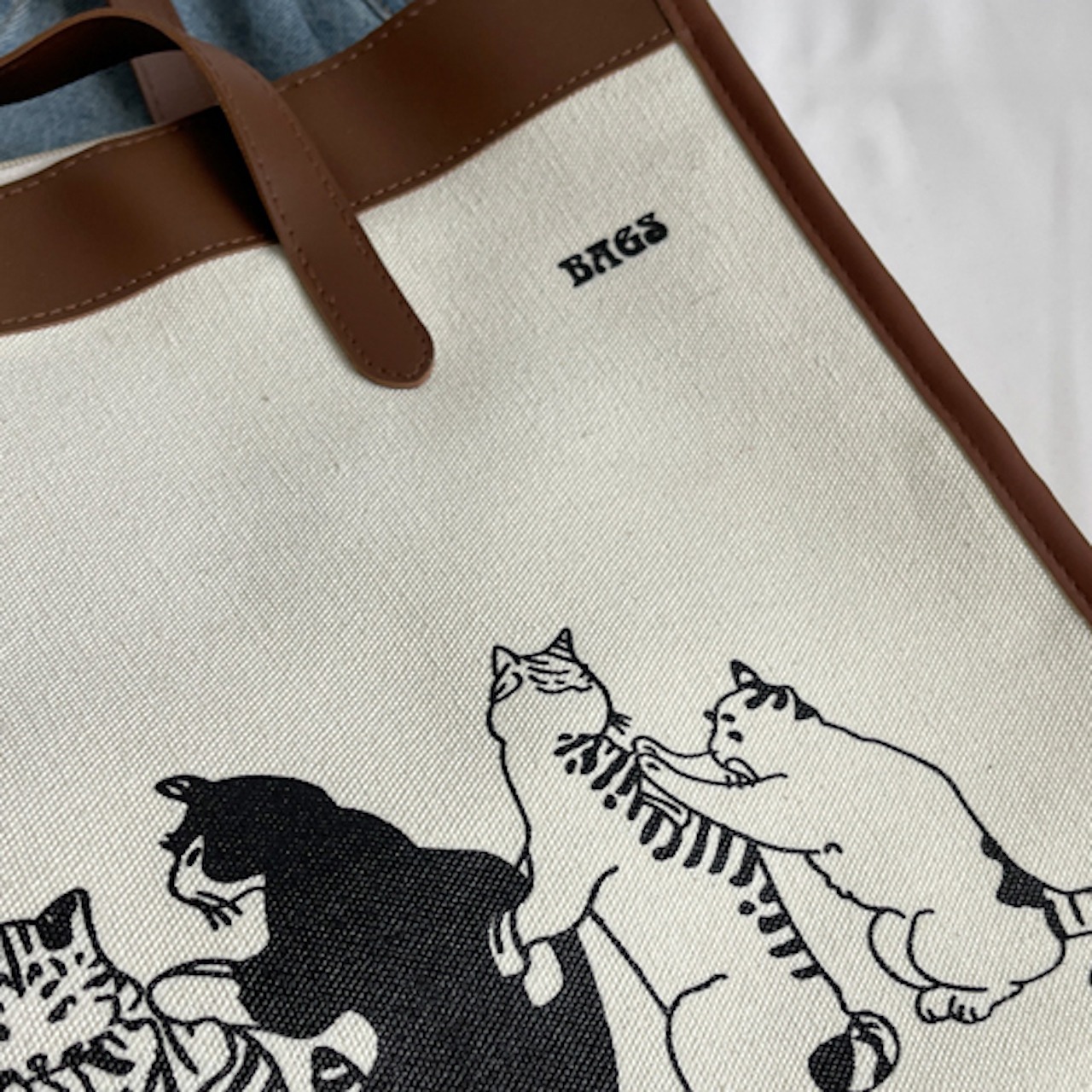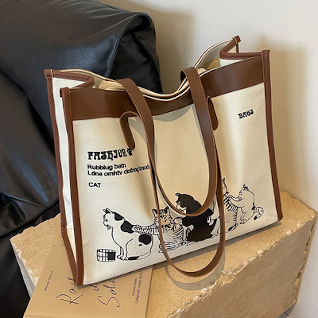 【送料無料】トートバッグ 3色展開 ブラック カーキ オフホワイト 猫 キャット かわいい 20代 通勤 通学 通学スタイル カレッジコーデ 大容量 お出かけ